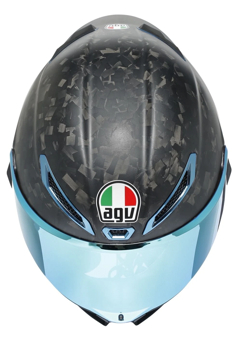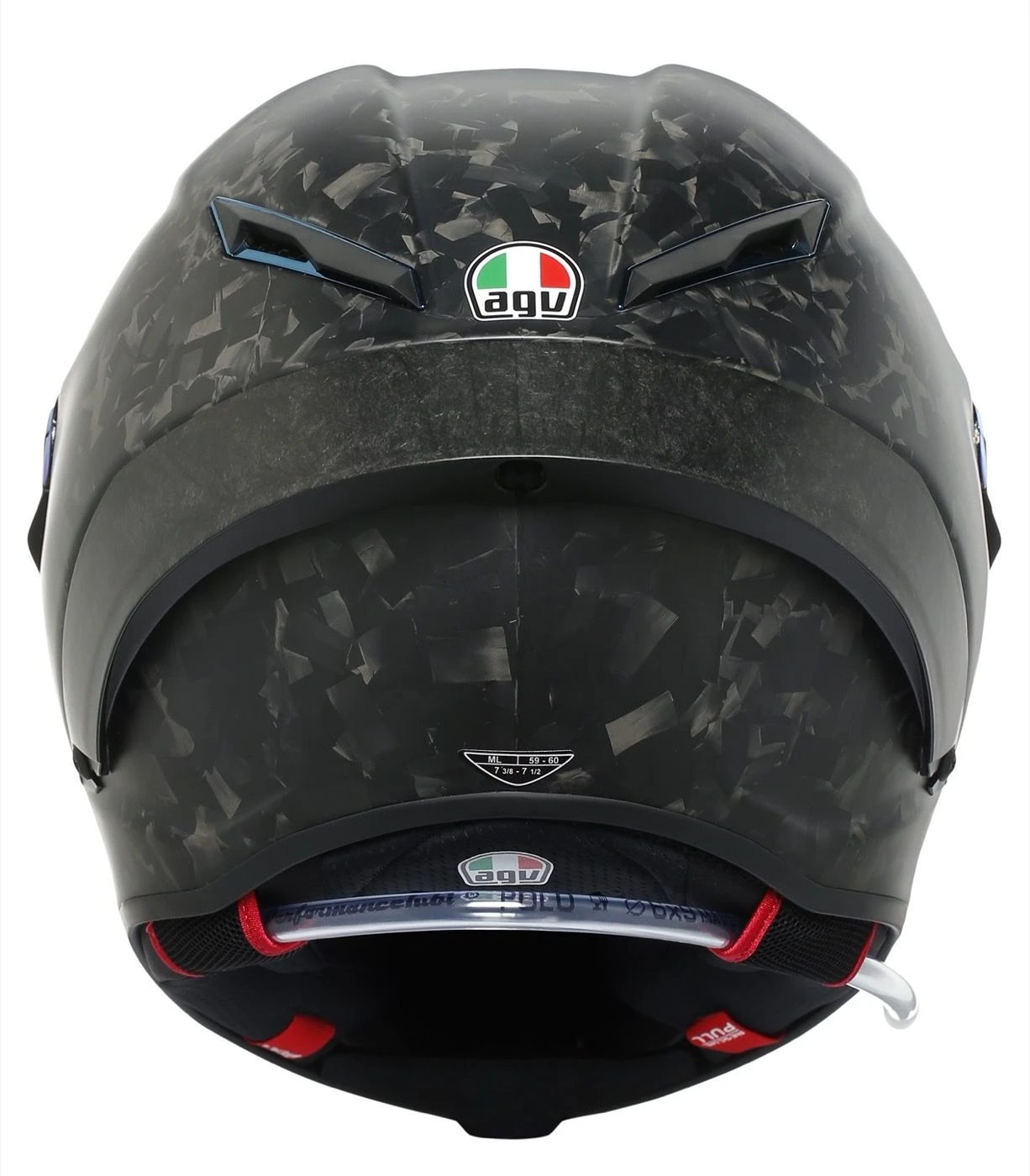 De Pista GP RR Futuro komt in speciaal forged carbon waardoor die extra sterkte biedt, maar bovenal unieke looks. De ventilatieopeningen en scharniermechanisme van het vizier zijn iridium blue gekleurd en daarbij komt standaard een Iridium Blue vizier bij de helm. De Pro spoiler is eveneens in Forged Carbon uitgevoerd.